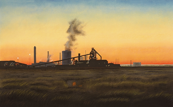 This artwork was inspired by the possible closure of the Corus Steelworks on Teesside and was produced during the time the works were mothballed in 2010. The image depicts the blast furnace on the South Gare, silhouetted against the setting sun. The box-shaped building in the distance is the nuclear power station at Hartlepool.