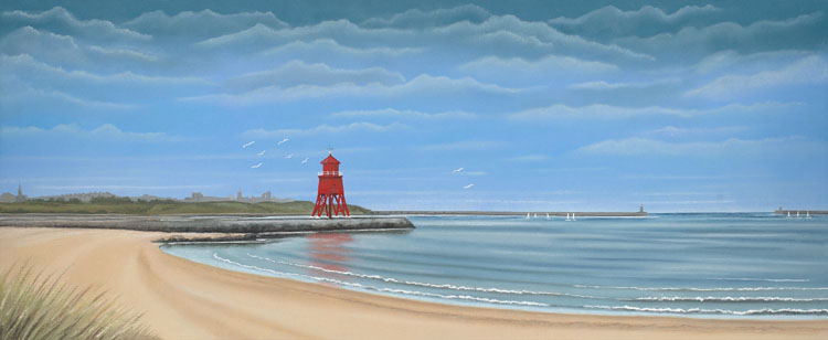Little Haven on the mouth of the River Tyne overlooking Tynemouth and its ruined old Priory on the cliff top. The old red lighthouse called 'The Groyne', marks the entrance to the river.